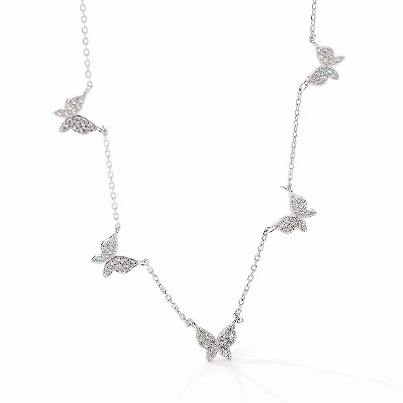 This is a silver multi butterfly necklace with cubic zirconia.