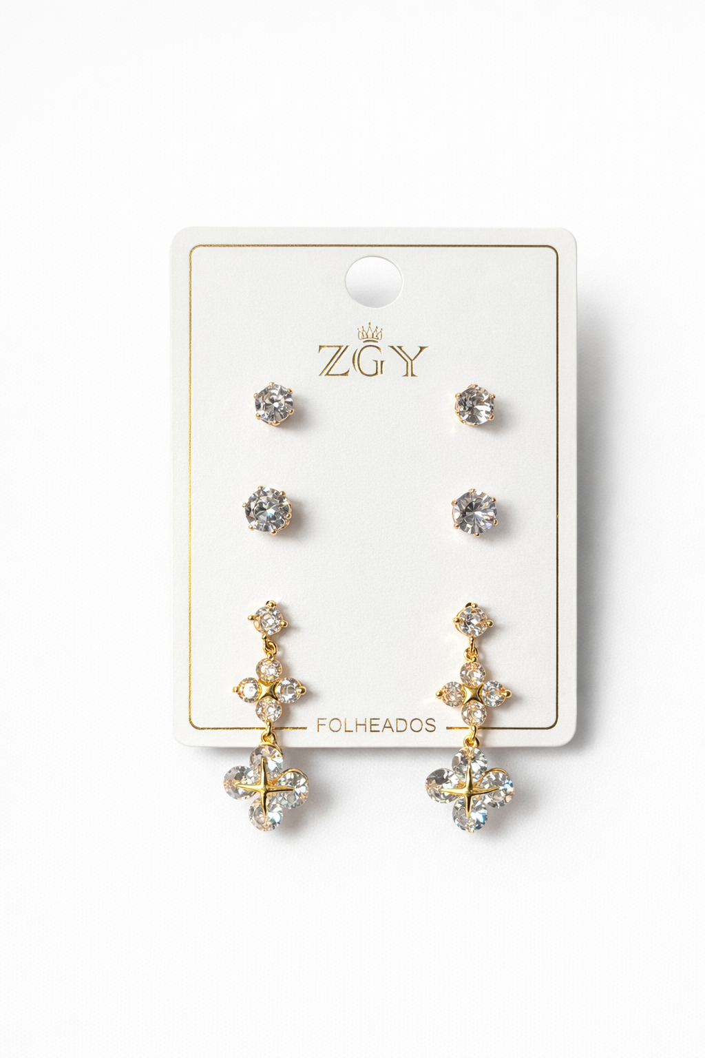 This is a set of gold toned earrings, featuring two pairs of square cubic zirconia studs and one pair of dangle earrings with a crystal.